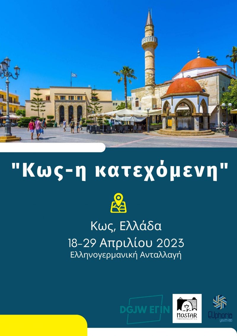Nέο Πρόγραμμα Eλληνογερμανικής Ανταλλαγής στην Κω! Τίτλος: “Κως η κατεχόμενη” Ποιοι: 10 άτομα, 18-30 ετών. Πού: Κως, Ελλάδα Πότε: 18-29/04/2023 Προθεσμία: 07/04/2023 Η Ελληνογερμανική ανταλλαγή που θα διεξαχθεί στο όμορφο νησί της Κω στοχεύει στην ανακάλυψη διαφόρων πτυχών του παρελθόντος και της ιστορίας του νησιού. Οι συμμετέχοντες θα έχουν την ευκαιρία να επισκεφτούν μουσεία και...Read More